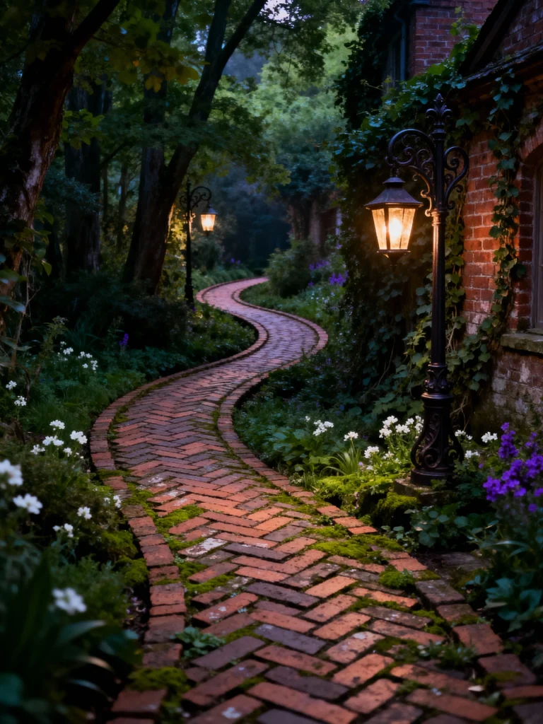 This scene is so enchanting, it feels like it’s out of a storybook! The winding brick path, covered in a soft mossy patina, leads you deeper into a beautiful, mysterious wood. The warm glow from the ornate black lamp posts is absolutely magical, casting light on the surrounding greenery and small white and purple flowers along the edge. The dark trees and the ivy-covered brick wall on the right give it a sense of quiet history and depth. It’s the perfect place for a thoughtful, peaceful evening walk.
