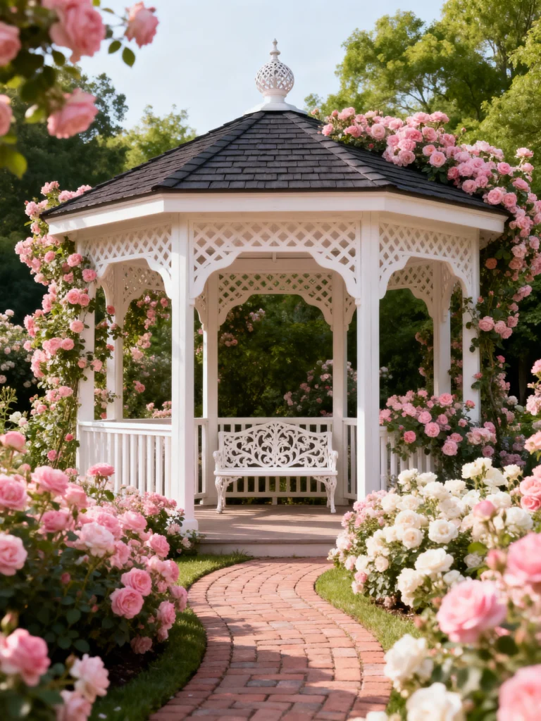 Talk about an instant fairy tale! If I had this gazebo, I’d spend all my time here reading or just admiring the view. The white lattice structure is perfectly complemented by those stunning climbing pink roses—they are truly the definition of romance in the garden. And see how that curved brick path gently welcomes you in? It leads right up to that charming white bench, making it the ideal focal point for a rose garden. It’s elegant, lush, and just looks like the sweetest spot for a quiet moment.