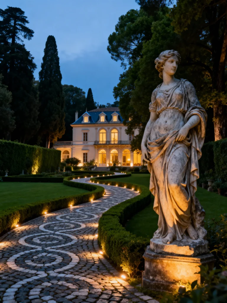 Okay, switching gears completely! This is pure drama and elegance. This stunning villa setting, captured at twilight, feels incredibly atmospheric. The lighting is just perfect, highlighting the beautiful cobblestone path with its repeating circle pattern—it’s almost hypnotic! The path is flanked by manicured hedges and soft ground lighting, leading the eye up to the warmly lit house. And that classical statue in the foreground adds such a magnificent, timeless feel. It’s truly a sophisticated and enchanting garden design.