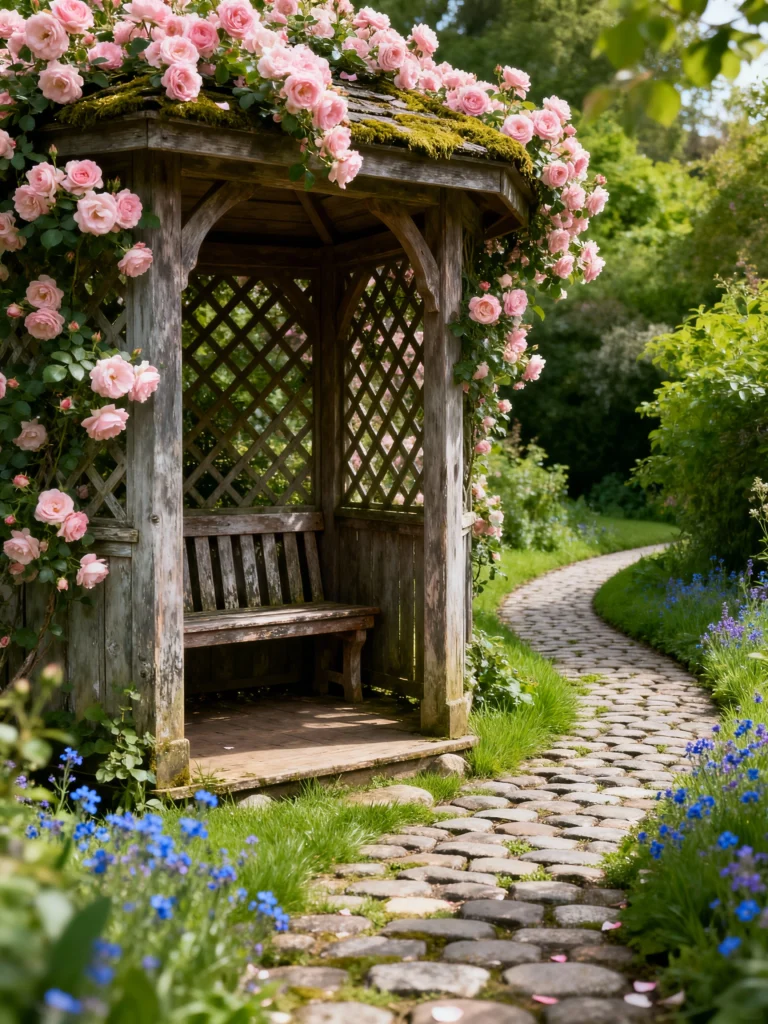 How cozy is this little spot? Tucked away in what feels like a secret garden, this rustic wooden shelter is a perfect hideaway. I love that it’s covered in climbing pink roses, giving it that romantic, slightly wild look. The path here is made of lovely, irregular, natural cobblestones, which look like they’ve been there forever. And the way the blue forget-me-nots spill over the edge of the path? It’s a gorgeous pop of color against the greenery, making this feel like the ultimate spot for quiet reflection.