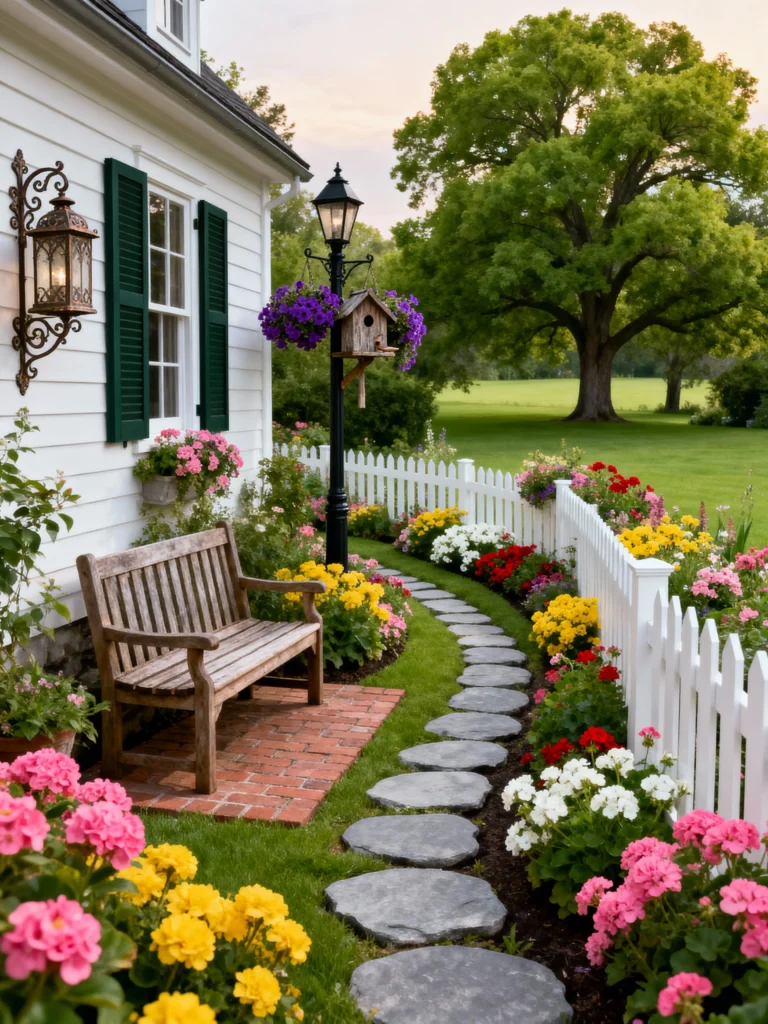 This is such a happy, colorful little corner! The way the smooth, grey stepping stones curve around the flower bed is so delightful, inviting you to explore what’s next. The contrast between the bright, cheerful mix of pink, yellow, and red geraniums and the clean white picket fence is fantastic. I love the simple wooden bench right next to the white siding of the house—it’s the perfect little nook to sit and enjoy the afternoon sun. The lamppost with the hanging flowers adds a classic, welcoming touch.