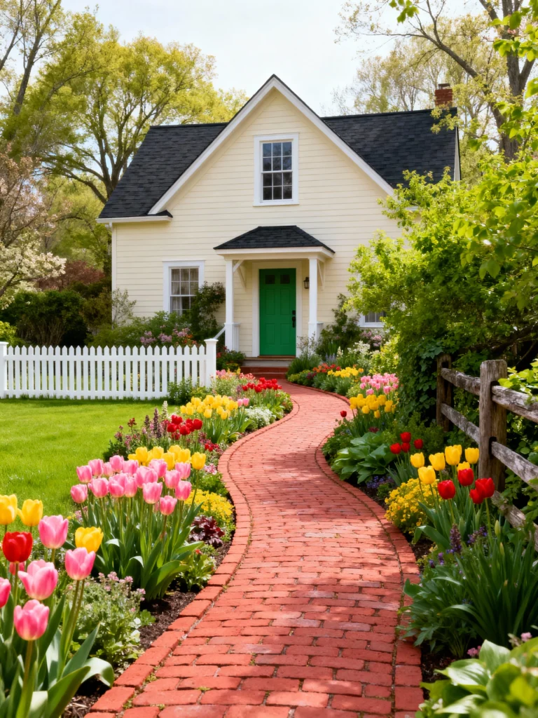 Stop and smell the tulips! Seriously, this curving brick pathway is spectacular, but those flowers are the real showstopper. The path is lined with an explosion of colorful tulips—pinks, yellows, and reds—making for an absolutely vibrant walk up to the house. The yellow siding and that unexpected pop of a bright green door give the whole scene a fresh, joyful energy. It’s a wonderful example of how a well-designed path and border can make a simple walk to the door feel grand.