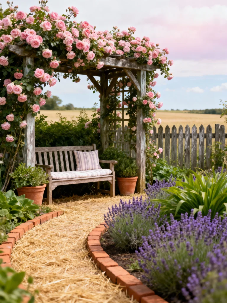 This image gives me major romantic, farmhouse vibes. That rustic wooden pergola, covered in those lush pink roses, is such a dreamy focal point. Beneath it, a cozy bench with a striped pillow is just begging for you to sit down and relax. The path here is interesting—it’s a simple, natural straw or mulch path framed by classic brick edging. And the border of fragrant purple lavender adds a beautiful, contrasting texture and color to the soft pinks and browns. It’s country charm at its best!