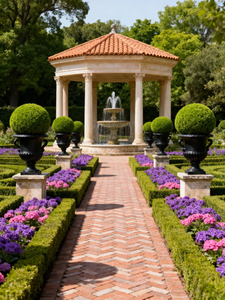 Now this is a grand entrance! This is a beautifully formal and structured garden design. The brick path is laid in a herringbone pattern, perfectly straight, leading to that elegant stone pavilion and tiered fountain. Everything is incredibly symmetrical, from the manicured boxwood hedges to the pairs of black urns topped with perfectly sculpted green globes. The bursts of pink and purple flowers add color without disrupting the refined geometry. It’s a masterclass in classic, stately landscaping.