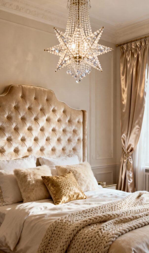 This room screams glamour with that stunning, starburst crystal chandelier – it’s definitely the focal point! The plush, tufted velvet headboard in a soft champagne color looks incredibly inviting. Paired with those silky gold curtains and layers of cozy, textured pillows and a chunky knit blanket, this is the ultimate romantic retreat. It feels like waking up in a five-star hotel. This look proves that a monochromatic, neutral palette can still be utterly dazzling when you mix rich textures like this.