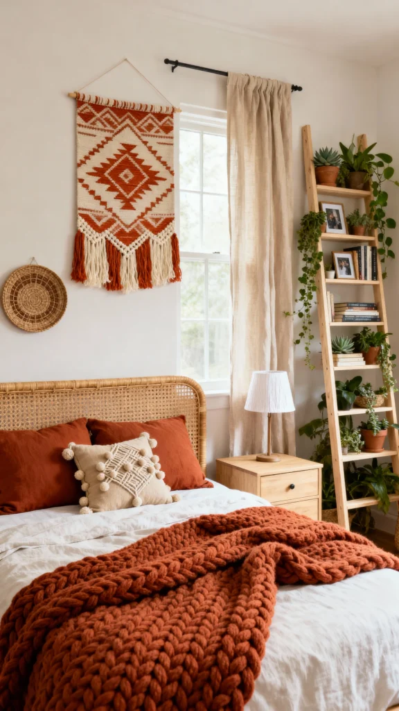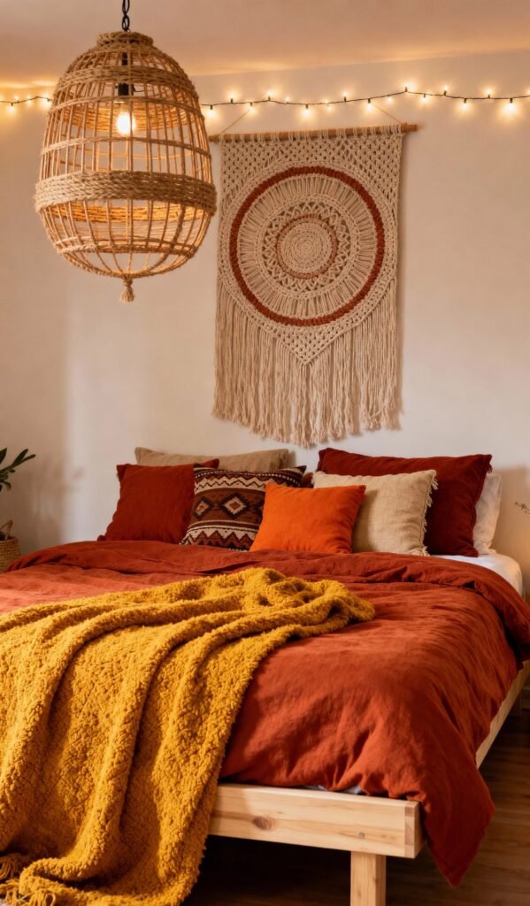 This room is radiating warmth! The combination of deep rust duvet and a vibrant mustard yellow throw is pure autumn perfection. The lighting is key here—the fairy lights draped across the wall add a soft, magical ambiance, and the large, woven wicker pendant light is a fantastic boho element. The macrame wall hanging above the bed ties in the natural textures beautifully. It’s relaxed, cheerful, and the wooden platform bed keeps the whole look grounded and effortlessly chic.