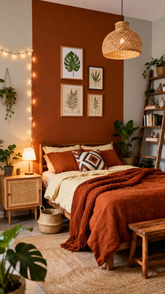 Here’s your ultimate indoor jungle retreat! The terracotta accent wall is perfectly warm and inviting, providing a beautiful backdrop for the framed botanical prints. The rattan light fixture and nightstand bring in essential natural textures, while the string lights add a cozy, playful twinkle. Layered textiles in burnt orange and pale yellow make the bed incredibly inviting. And of course, the various potted plants make the room feel fresh, organic, and truly alive.
