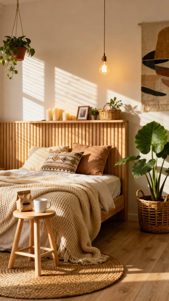This bedroom is all about soft light, clean lines, and natural materials—very Scandi-inspired! The slatted wood headboard is a fantastic architectural feature, and the light, woven rug and simple wooden stool enhance the organic feel. The color palette is calming, using layers of cream, beige, and tan in the bedding and throws. It feels incredibly peaceful, especially with the morning sun streaming through the window, highlighting the simple plants and the glow of the candles. A perfect minimalist sanctuary.