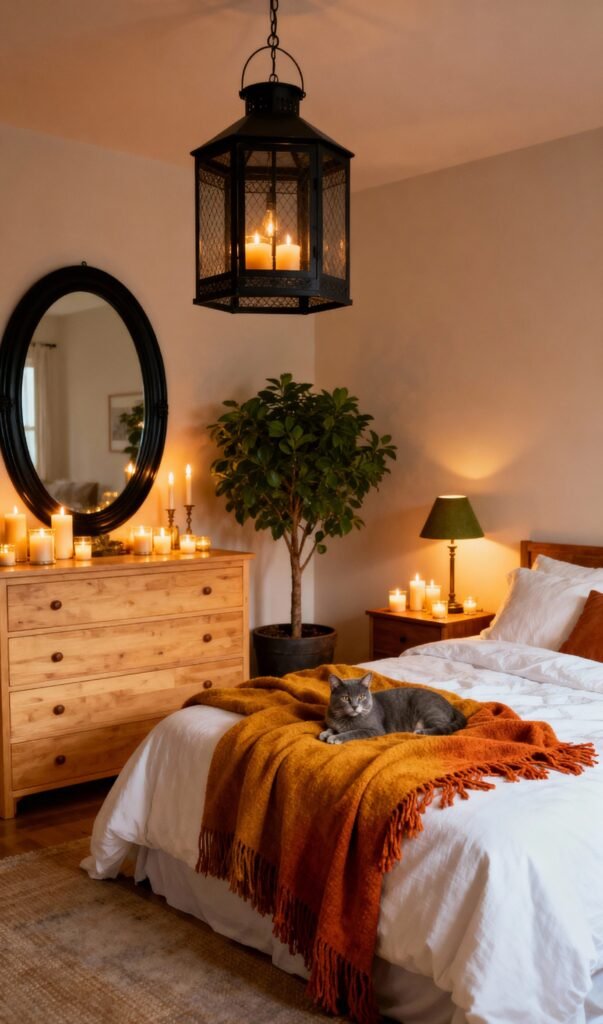 Excuse me while I curl up here! This bedroom achieves that perfect, intimate “hygge” feeling with an incredible amount of candlelight. The black lantern-style pendant and the abundance of pillar candles on the dresser and nightstand cast a warm, flattering glow. The simple white bedding contrasts beautifully with the rich, mustard-and-burnt-orange throw, adding a pop of color. And let’s not forget the adorable gray cat making it even cozier! The oversized mirror reflects all that gorgeous light—smart move!
