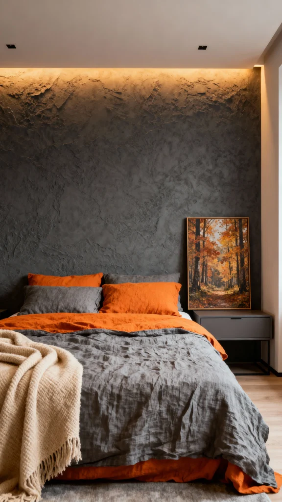 This is a masterclass in modern, masculine design with a cozy twist. The dark, textured gray wall provides a dramatic, industrial backdrop, immediately creating a sophisticated, moody atmosphere. The sharp, vibrant orange bedding is a stunning and unexpected contrast against the charcoal gray linen duvet—it feels like an autumn forest explosion against a stormy sky, which is reinforced by the framed painting. The integrated backlighting above the bed highlights the texture of the wall perfectly.