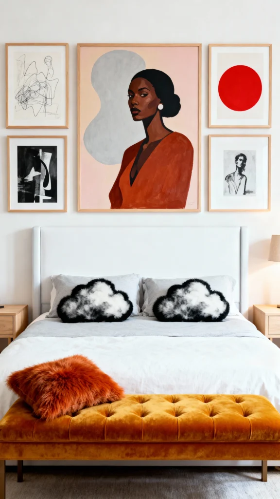 Talk about making a statement! The gallery wall above the simple, white headboard is the star here, featuring a fantastic mix of modern art, with the central piece repeating the rich rust/orange tone. The crisp white bedding keeps the focus on the art and the incredible bench at the foot of the bed. That upholstered, tufted mustard-yellow bench is a luxurious touch! The playful, cloud-shaped pillows add a touch of whimsy to this otherwise very clean and contemporary space.
