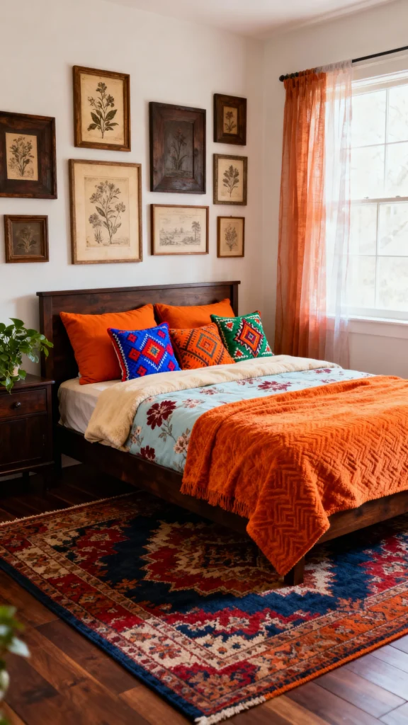 This room is a celebration of color and pattern! The dark wooden bed and the gallery of vintage botanical prints provide a traditional base, which is immediately energized by the bold bedding choices. The bright orange throw is stunning, but it’s the mix of the patterned throw pillows and the light blue floral duvet that makes it truly eclectic and fun. The large Persian-style rug on the floor anchors the entire space with deep navy and rich reds—a truly lively and maximalist look!