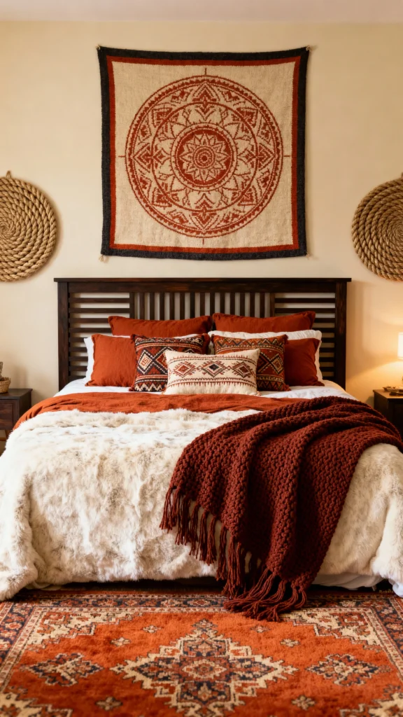 If cozy and grounded is your vibe, take notes! The dark wooden slatted headboard provides a strong, rustic anchor, perfectly complemented by the warm, terracotta, and burnt orange accents. I absolutely love how the large woven tapestry and the patterned area rug bring in a beautiful, tribal-inspired texture and pattern mix. The cream, shaggy duvet adds a soft, inviting contrast to the rich, earthy tones. It feels incredibly warm and collected, like a perfect bohemian getaway right at home.