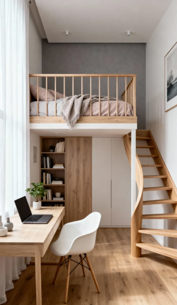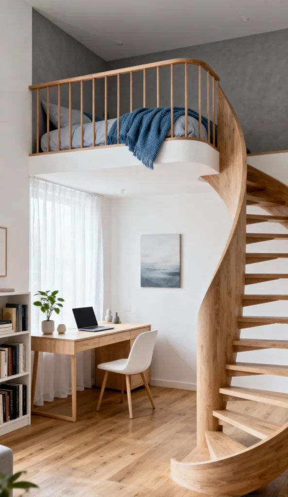 Wow, now this is a statement piece! The gorgeous curved wooden staircase and matching rounded bed railing in this design are incredibly chic. It truly elevates the loft bed concept into a piece of architectural art. Downstairs, there’s a neat, minimalist desk that keeps the lower area feeling open and bright, thanks to the sheer white curtains. This look proves that even in a small space, you can have a sophisticated, flowing design.