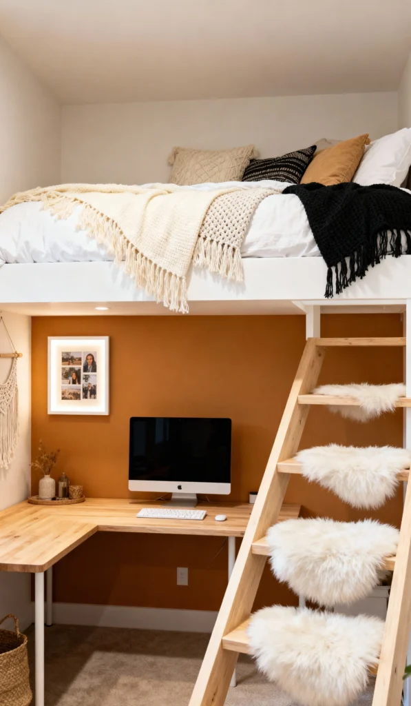 This setup proves that a loft bed can be stylish and playful. The simple white bed frame contrasts perfectly with the bold, warm orange accent wall underneath. This pop of color creates a focused and energetic workspace. The corner desk maximizes the lower area, and the cozy white sheepskin rugs draped over the ladder are a fun, unique touch that adds softness and texture to the whole space.