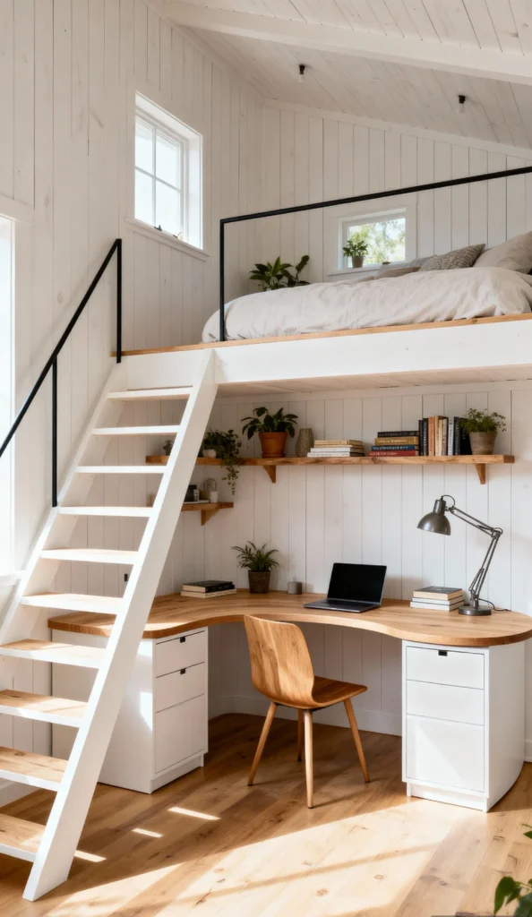 This setup, with its white planked walls and natural light, gives off major modern cabin vibes. Instead of a ladder, the design uses built-in stairs, which are much easier to navigate—and they look fantastic! I love how the natural wood desk is curved, making the workspace feel custom and inviting. Adding potted plants and floating shelves helps blend the workspace seamlessly into the elevated, tranquil sleeping area.