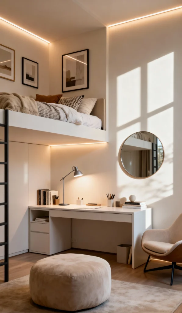 This design is all about the mood lighting! The hidden LED strips running along the base of the loft bed and near the ceiling give the entire room a sophisticated, warm glow—especially nice for a night worker or late-night reading. The white desk and chair keep the look super clean and modern, and the large round mirror helps bounce light around and makes the entire room feel bigger.