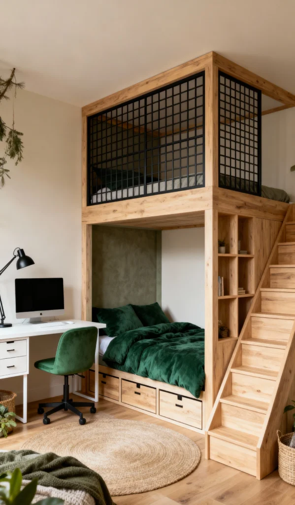 Who says a loft bed has to be only a loft? This design features a bed on both levels—one up and one nestled in a cozy alcove below! The rich, emerald green bedding and dark metal cage railing give it a dramatic, sophisticated flair. The wooden stairs with side shelving add both functionality and warmth. This is an awesome idea for siblings sharing a room or if you want a chill-out nook instead of a second bed.