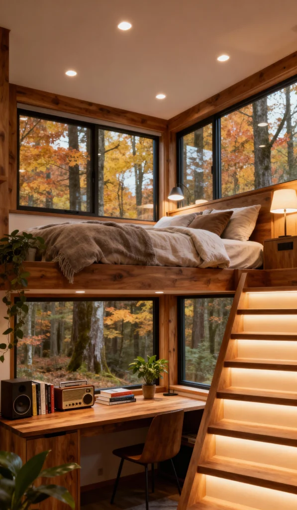 Okay, how incredible is this? This loft bed truly makes you feel like you’re sleeping in a luxurious treehouse! The rich, warm wood tones and the massive windows that frame the beautiful autumn woods are the absolute highlight. Look closely: the stairs have built-in ambient lighting, which is a super cool feature for safety and mood. Underneath, a cozy workspace lets you enjoy that gorgeous view all day long.