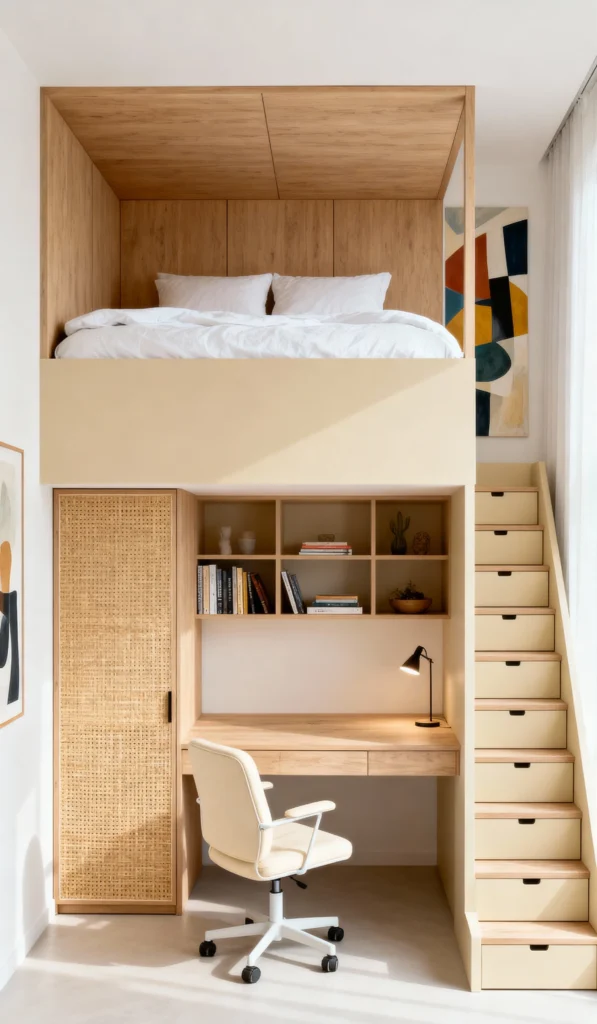 This loft bed is all about texture and clever hiding spots. The sleeping pod upstairs has a cozy, enclosed feel, while the stairs double as a bank of pull-out drawers—genius for extra storage! Downstairs, the rattan-front cabinet adds a lovely touch of texture, balancing the clean lines of the desk and shelving. The creamy, neutral palette keeps the whole structure from feeling bulky, making it warm and inviting.
