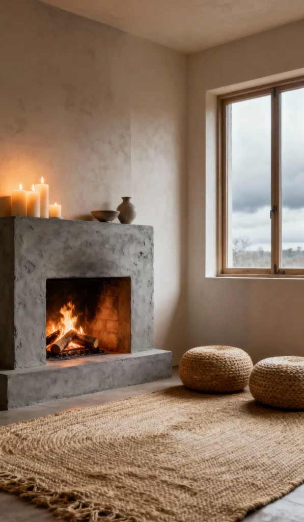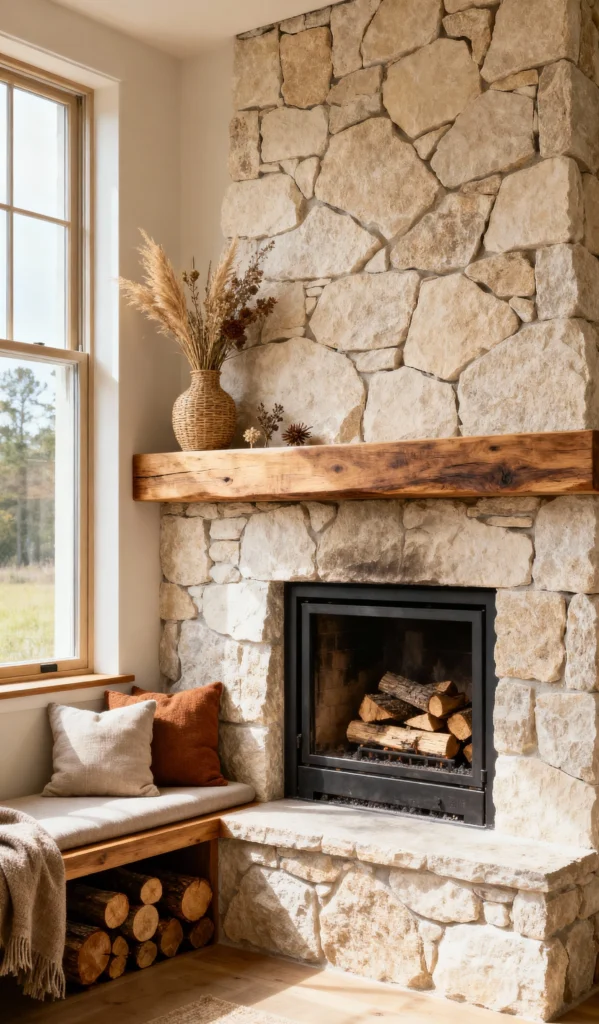 This fireplace is the definition of rustic comfort. I adore the massive, light-colored stacked stone that gives it such a grounded, earthy feel. The thick, raw-edge wood mantle adds the perfect touch of warmth and serves as a lovely spot for simple, organic decorations. Plus, that built-in wood storage and cozy window bench? Genius for creating a little reading nook!