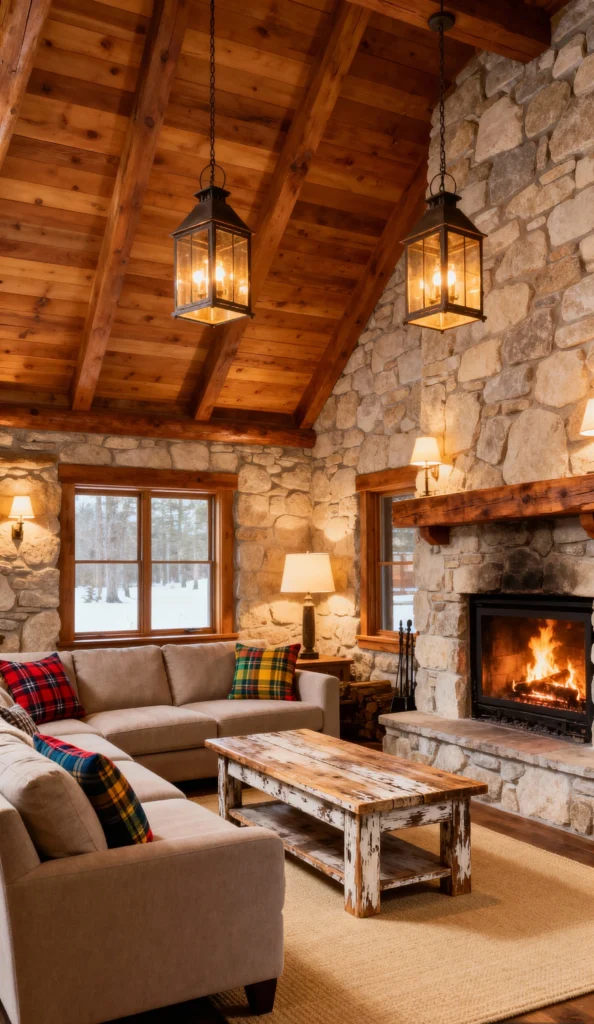 This space perfectly blends stone textures with rich wood tones. The vaulted, slatted wood ceiling is gorgeous, and the heavy stone fireplace anchors the whole room. I love how the warm lighting from those large hanging lanterns and the classic plaid pillows make the entire seating area feel so inviting—it’s the ideal spot for a post-skiing cuddle!