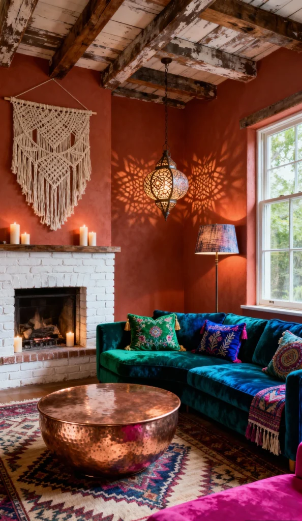 If you love color and texture, you’ll love this! this vibrant living room is bursting with bohemian flair. The white painted brick fireplace provides a clean contrast to the stunning terracotta-red walls and the exposed, distressed ceiling beams. The rich jewel tones of the velvet couch and the beautiful copper coffee table make this whole space feel instantly energetic and chic.