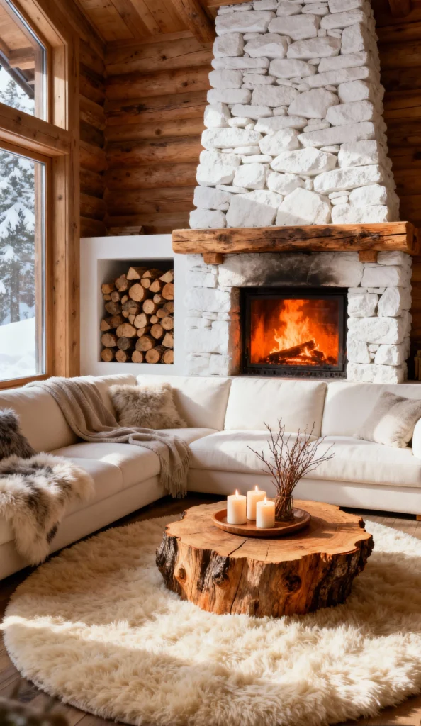 This is pure winter wonderland coziness The white stone fireplace and mantle are absolutely breathtaking against the natural wood walls. The white, plush sectional and shaggy rug make the whole room feel like a cloud. That huge, circular wood slab coffee table is the perfect rustic anchor for the bright, airy space. It’s the ultimate spot to watch the snow fall!