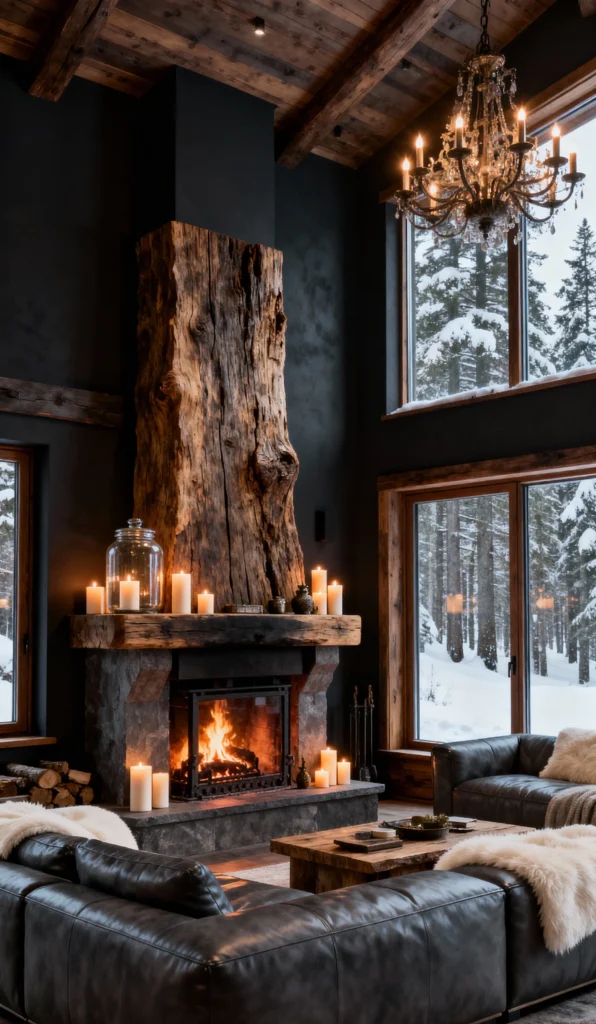 This is drama in the best way! ,the dark walls and colossal, raw-tree-trunk fireplace surround create a moody, luxurious lodge atmosphere. It’s absolutely stunning. The huge windows looking out onto the snowy scene, paired with the abundant flickering candles and the grand chandelier, make this space feel incredibly cinematic and warm. I’d never leave this room!