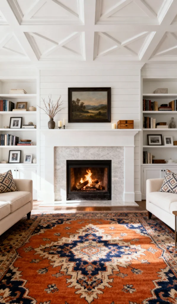 This look is undeniably classic and elegant. The white mantle and shiplap wall provide a beautiful frame for the fireplace, which features a gorgeous, subtle marble surround. The built-in shelving keeps the space feeling neat and tailored. The highlight, for me, is that amazing, colorful vintage rug that adds a perfect pop of warmth and pattern to a refined space.