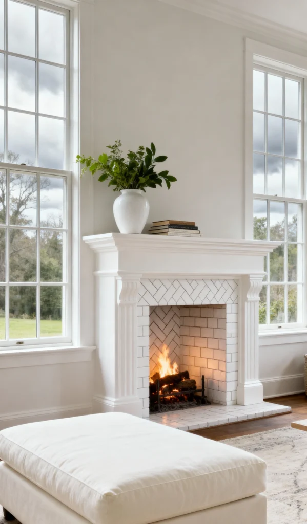 This fireplace gives off a beautiful modern farmhouse or traditional vibe. The bright white mantle is stunning and the herringbone tile pattern inside the fireplace adds a lovely texture and contemporary detail. Flanked by those tall, classic windows, the whole room feels incredibly light and airy—a sophisticated and clean space to enjoy a fire.