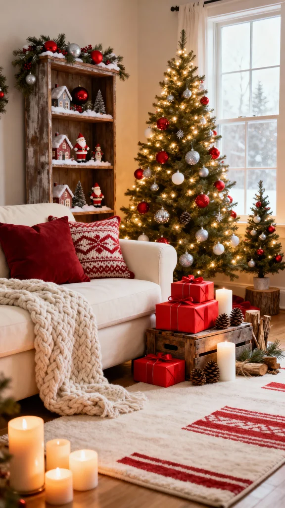 Red, white, and ready for Christmas! This living space is full of cheer. The chunky knit throw blanket and the cozy white sofa make it look incredibly inviting. The red and white knit pillows and the patterned rug add a lovely festive touch without feeling too busy. I love the simple but beautifully styled wooden shelf unit holding those adorable little snow-covered houses and Santas. It’s a bright, cheerful, and relaxed take on classic Christmas.