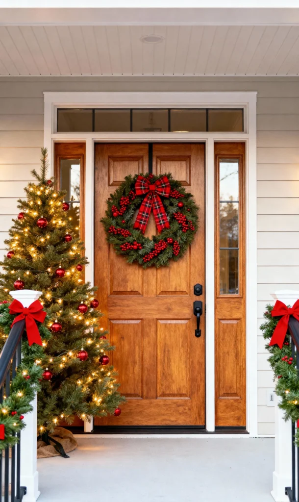 Talk about curb appeal! This front door setup is so welcoming. The beautiful wooden door is perfectly framed by the festive garland on the railings, the little twinkling Christmas tree, and, of course, that gorgeous wreath with the plaid bow. It gives a lovely, traditional vibe without being overdone. Imagine walking up to this house on a snowy evening—it instantly puts you in the holiday spirit before you even step inside!