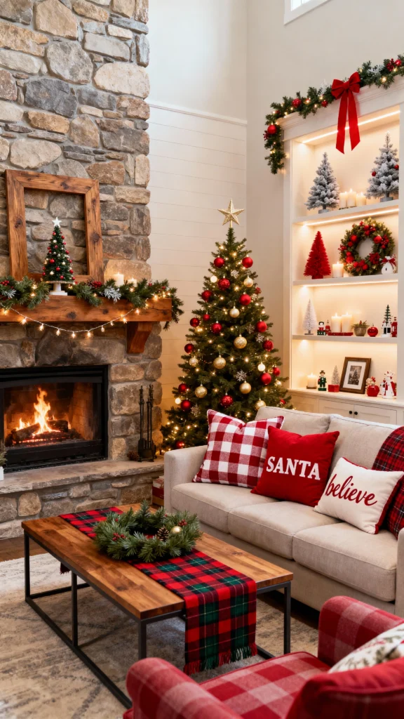 If you love farmhouse style, this is your inspiration! The stunning stone fireplace paired with the wooden mantle and plaid accents gives a wonderfully rustic, cozy feel. The red and black buffalo plaid on the pillows, table runner, and armchair ties everything together with a punch of color. I adore how the built-in shelves are styled with miniature trees and candles—it adds height and a beautiful glow. It looks like the perfect place to curl up and listen to Christmas carols.