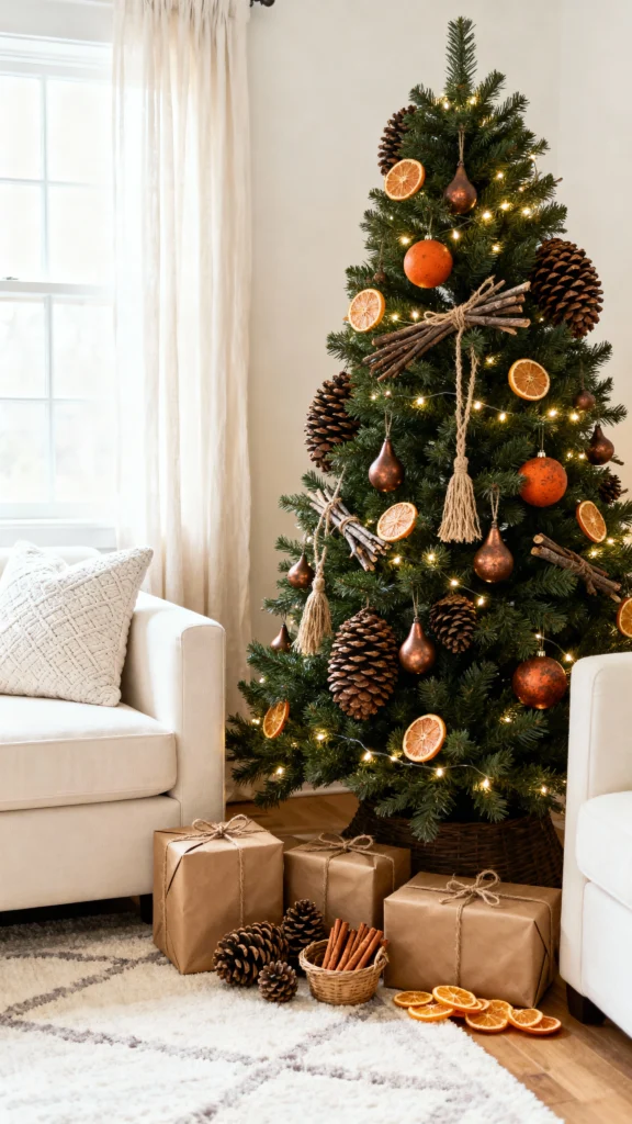 For those who love a more organic, rustic look, this tree is a winner! Instead of traditional baubles, it’s adorned with large pinecones, dried orange slices, and little bundles of twigs. The natural tones continue with the simple brown-wrapped gifts beneath the tree. It’s a wonderful way to bring the outside in and creates a warm, earthy, and unique holiday centerpiece that smells amazing!