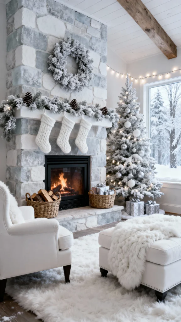 This room is a stunning example of how to do a “white Christmas” indoors. The whitewashed stone fireplace and the flocked Christmas tree create a beautiful, snowy aesthetic, enhanced by the view of the actual snowy landscape outside. The white knit stockings and the furry textures on the chair and ottoman make this space look incredibly soft and warm. It’s like stepping into a peaceful, cozy winter retreat. Snowy chic!