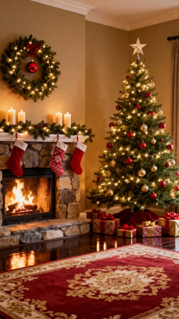 This picture just screams classic Christmas! The rich, red and gold ornaments on the beautifully lit tree perfectly match the luxurious, ornate rug. And look at that fireplace! The stone hearth, the warm glow of the fire, the simple garland, and those three cozy stockings hung up… it creates such a wonderfully inviting, traditional scene. It makes you want to grab a mug of hot cocoa and settle in for a long winter’s nap.
