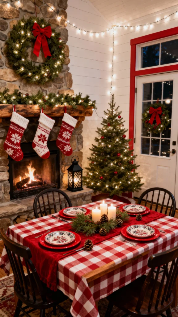This dining area looks ready for a wonderful holiday meal! The traditional stone fireplace provides that cozy, rustic background, but the real star is the table. The red and white gingham tablecloth, the coordinating runner, and the festive centerpiece of pine, pinecones, and candles create a perfect setting. It feels like a beautiful, intimate, and cheerful spot for friends and family to gather and enjoy the holiday season.