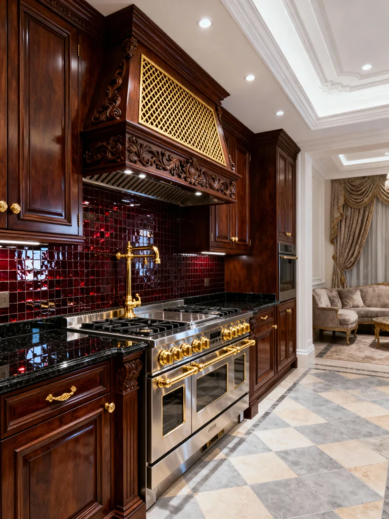This kitchen is pure glamour! The dark cherry cabinetry is paired with a dramatic, deep-red glazed tile backsplash that reflects light beautifully—what a bold choice! It makes the stainless steel and gorgeous gold-plated range really pop. The custom range hood, featuring decorative gold lattice work, is another stunning focal point. This kitchen flows right into an elegant living space, showing that the kitchen can be just as stylish and sophisticated as any other room in the house. It’s a perfect example of modern luxury blended with traditional form.