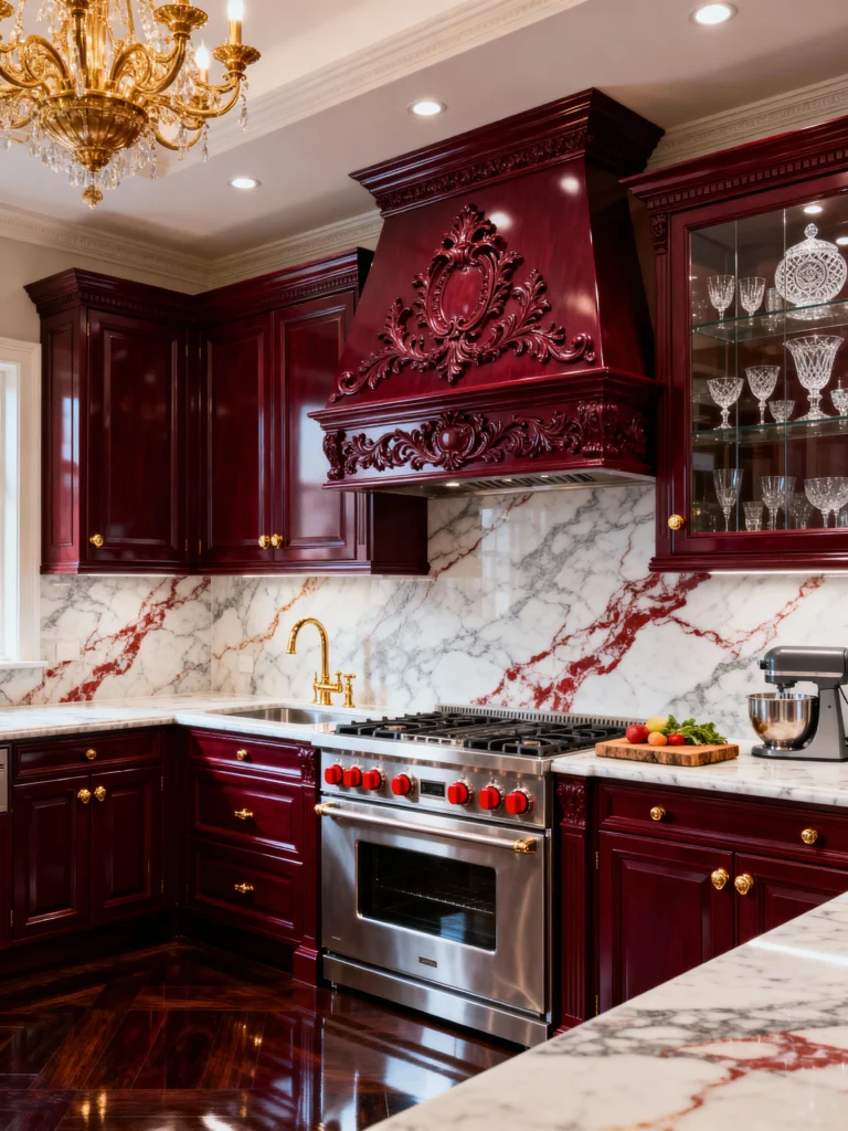 This kitchen is giving off some serious royal vibes, right? The rich, deep red tone of the cherrywood here is elevated to pure luxury by the striking Calacatta-style marble backsplash and countertops. Look at those dramatic red-veined patterns—it’s like art! The highly ornate, custom wood range hood is the undisputed star, and the gilded chandelier and matching brass hardware and faucet truly solidify that opulent, classic French feel. It’s a statement kitchen that doesn’t hold back. If you love drama and sparkle, this pairing of deep wood and bold stone is definitely for you.