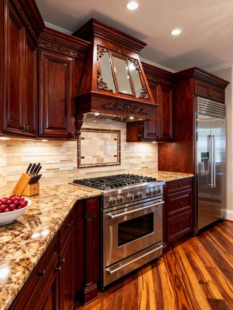 If you’re into warmth and natural textures, this one’s for you. The combination of the reddish cherry cabinets with the gold, brown, and cream-flecked granite countertop and backsplash is just gorgeous. It’s incredibly rich and grounding. The backsplash tiles have a lovely subtle pattern that complements the stone perfectly. Notice the beautiful detailing on the wood range hood, which incorporates mirrored panels—a unique touch that adds a bit of light and visual interest! Paired with the stainless steel professional-style range, it strikes a wonderful balance between rustic warmth and serious cooking functionality.