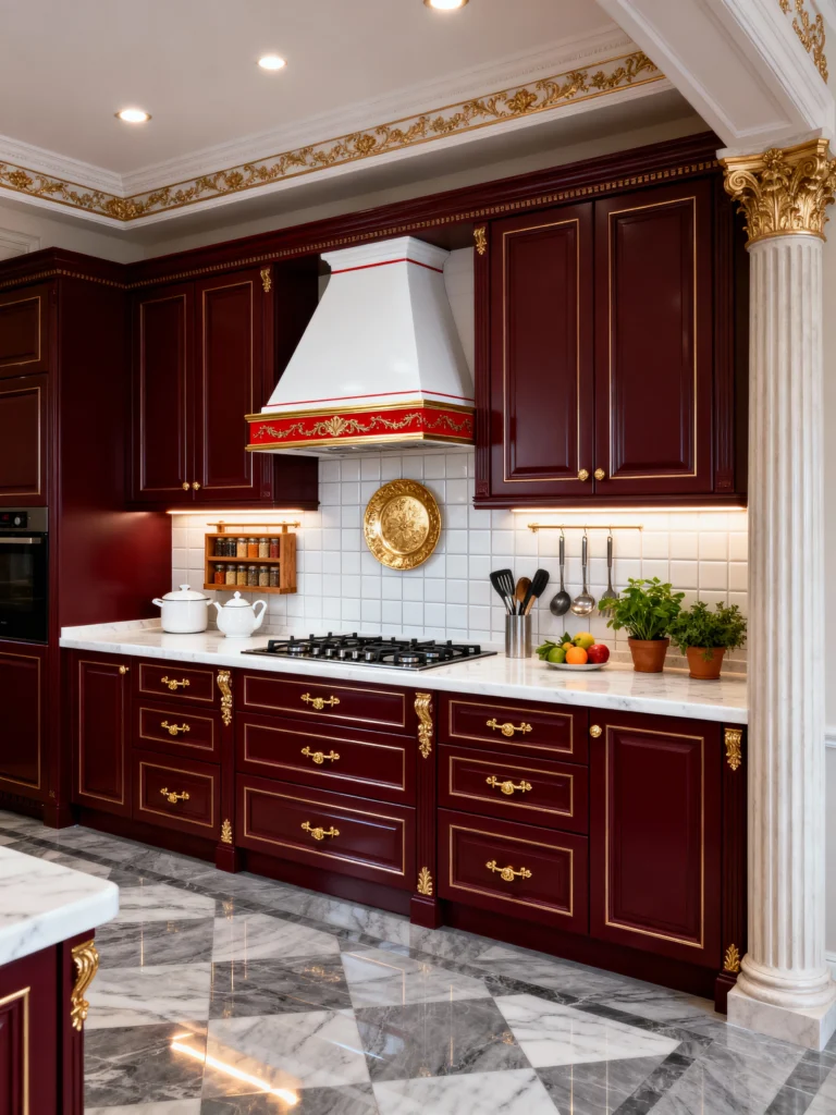 This design leans heavily into a classical, European aesthetic. The cherry cabinets are beautifully trimmed with intricate gold detailing—from the molding around the doors to the decorative gold cabinet pulls. And can we talk about that column? It’s a bold architectural choice that screams luxury. The contrast with the simple white subway tile backsplash keeps the focus on the cabinetry, while the gold accents on the range hood and the decorative wall plate tie everything together. The black and white marble floor is the perfect final touch, adding movement and depth without competing with the ornate cabinets.