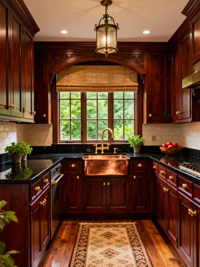 What a charming and intimate U-shaped kitchen! The cherry cabinets here are paired with black granite countertops for a dramatic contrast. What really grabs my attention, though, is that stunning copper farmhouse sink—it brings such a warm, inviting glow! The copper complements the brass faucet and the gold-toned hardware beautifully. The window, framed by a gorgeous wood arch and a natural woven Roman shade, lets in beautiful light. Everything is tied together with a subtle tile backsplash and a cozy runner rug, making this feel like a truly tucked-away, special space.