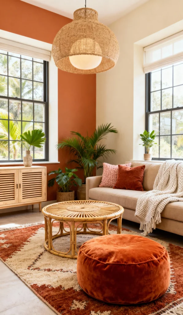 Talk about cozy! This space nails the modern bohemian look with that gorgeous terracotta accent wall and the rich, rusty rug pattern. The focus is definitely that show-stopping woven pendant light and the rounded rattan coffee table, bringing in all that essential texture. It feels warm and inviting, especially with the plush velvet pouf and the comfy throw blanket. Plus, those tall, lush plants really make the whole room breathe.