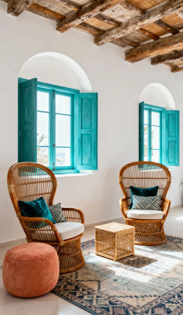 Welcome to a peaceful, sun-drenched sanctuary! The high-backed rattan chairs are simply gorgeous and give this room a sophisticated, airy feel. Once again, that punch of bright teal on the window shutters really pops against the clean white walls and rustic wooden beams. The subtle patterned rug ties in the orange pouf and natural wood beautifully. It’s a perfect spot for reading and relaxing.