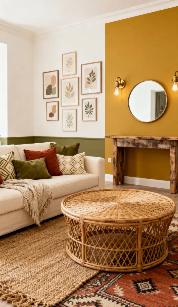 If you’re into earthy tones, this one’s for you! The mustard and olive green color-blocking on the wall is so sophisticated and grounds the whole room. That gallery wall with the abstract botanical prints is such a clean, modern touch! But the real star is the oversized, round woven coffee table, bringing in that classic boho texture. The mix of patterned and velvet cushions on the sofa looks incredibly snug.