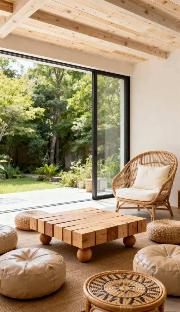 This room is pure laid-back luxury! The natural light spilling in from the huge sliding glass door connects the indoor space seamlessly with that lush backyard, making it feel like an outdoor lounge. I absolutely adore that blocky, wooden coffee table—it’s so grounded and chic. Paired with the rattan chair and all those leather poufs on the woven rug, this is the ultimate spot for a relaxed, shoes-off gathering with friends.