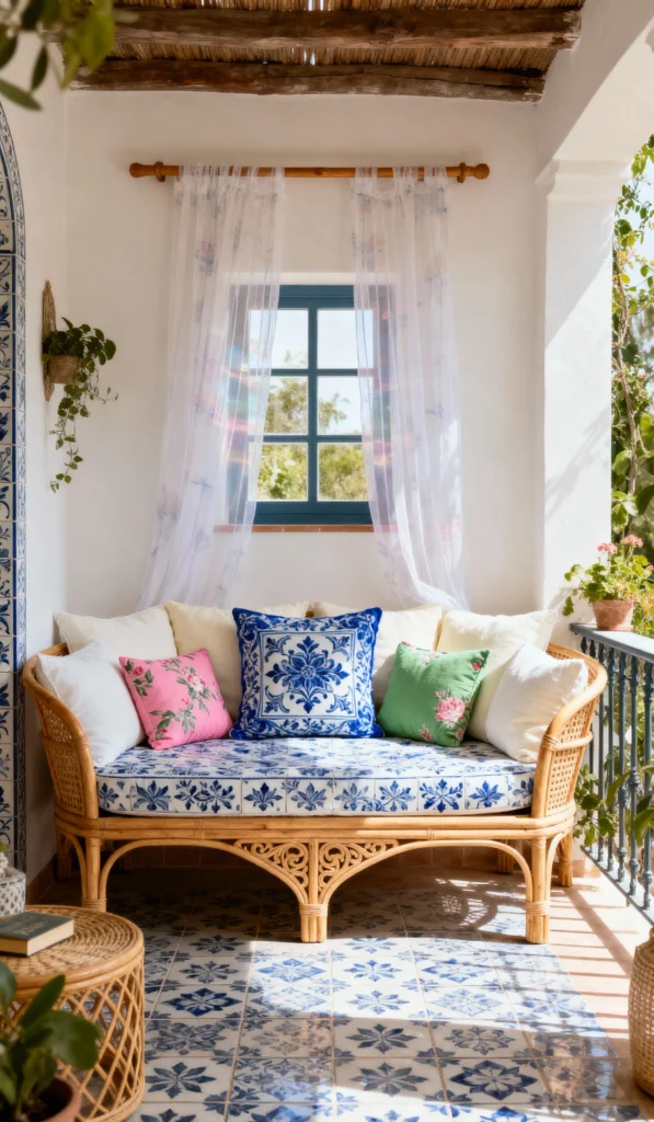 How beautiful is this little veranda? The blue and white patterned tile floor is just stunning and acts as the perfect foundation for the space. The natural rattan bench is softened by the mix of pillows, especially that striking blue and white floral center cushion. The sheer, breezy curtains over the window add a touch of romance and filter the sunlight beautifully. It feels like a chic, tiled sanctuary.