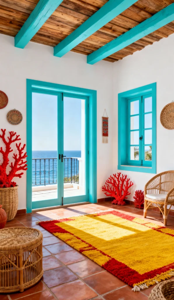 Hello, Mediterranean dream! The crisp white walls and ceiling beams pop against the breathtakingly vibrant turquoise on the doors and window. It feels like a sunny taverna overlooking the sea! The huge splash of color from that bold red and yellow woven rug instantly brings the heat. Those bright red coral sculptures and the simple rattan seating are just the perfect finishing touches to a truly memorable, high-energy room.