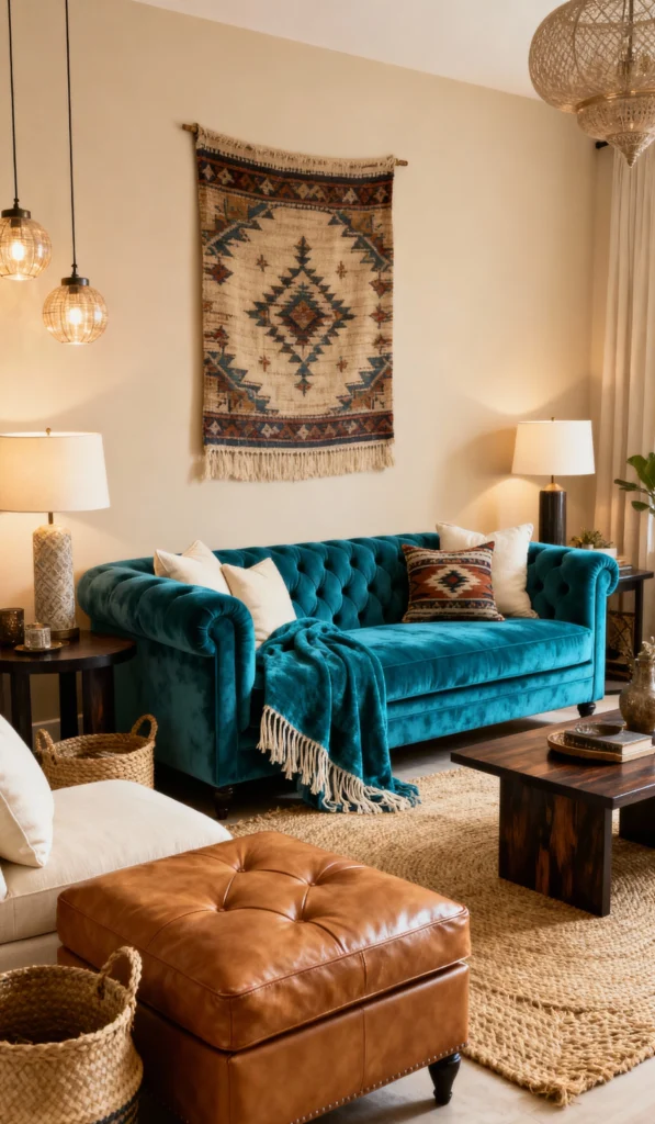 Oh my goodness, that velvet sofa!The deep, tufted turquoise is such a bold and luxurious focal point in this otherwise neutral room. I love how it’s paired with that chunky leather ottoman and the woven rug and baskets for an unexpected mix of textures. The patterned textile hanging above the sofa and the globe pendant lights add an ethnic, well-traveled flair. This is cozy-meets-glam!